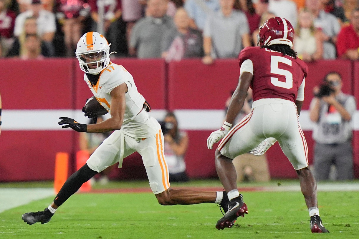 Tennessee wide receiver Chris Brazzell II (17) tries to get past Alabama defensive back Dijon Lee Jr. (5) during a college football game at Bryant-Denny Stadium in Tuscaloosa, Ala., on Oct. 18, 2025.