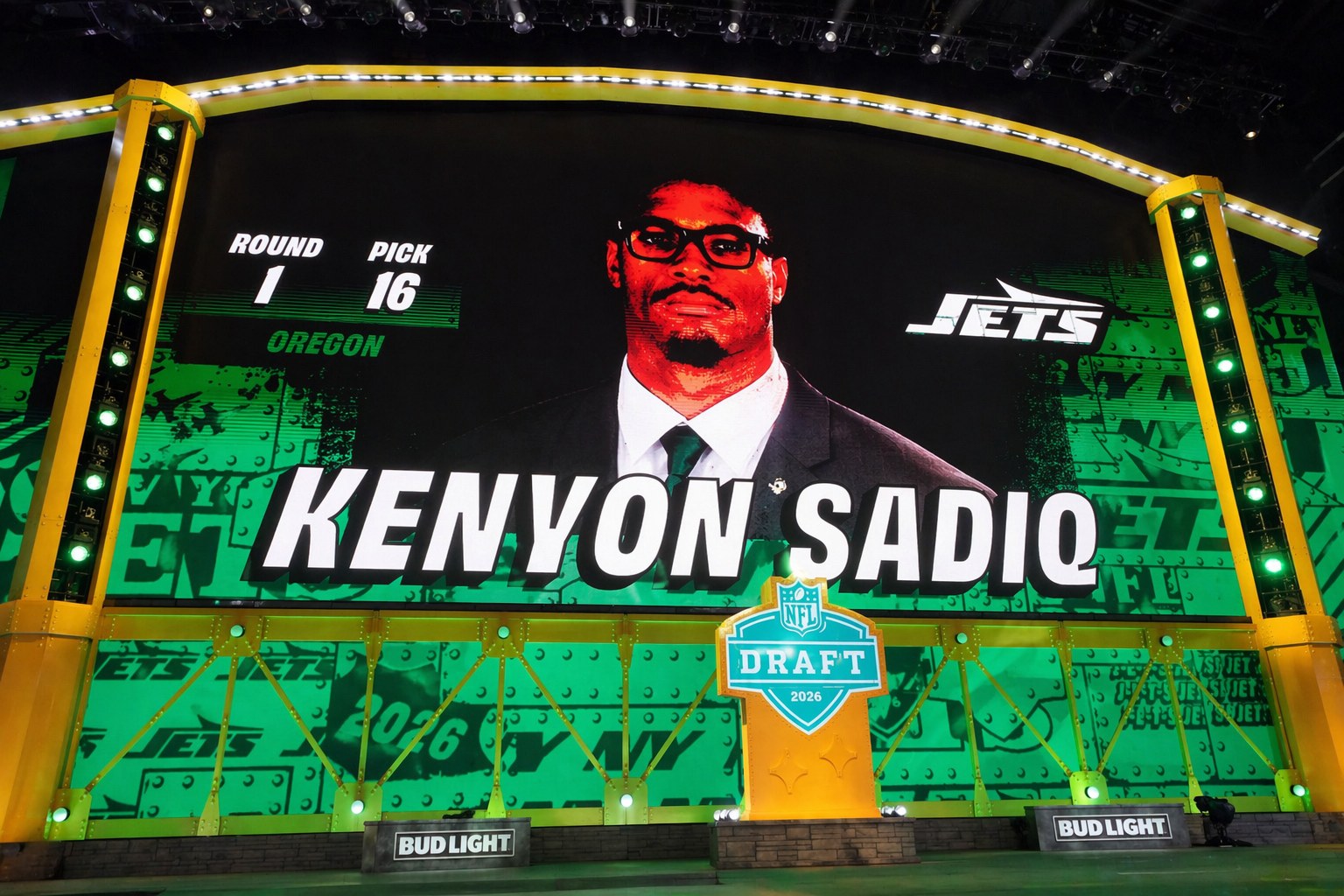 The New York Jets used their second first-round selection in the 2026 NFL Draft to select Kenyon Sadiq with the No. 16 overall pick, adding another offensive weapon to the roster.